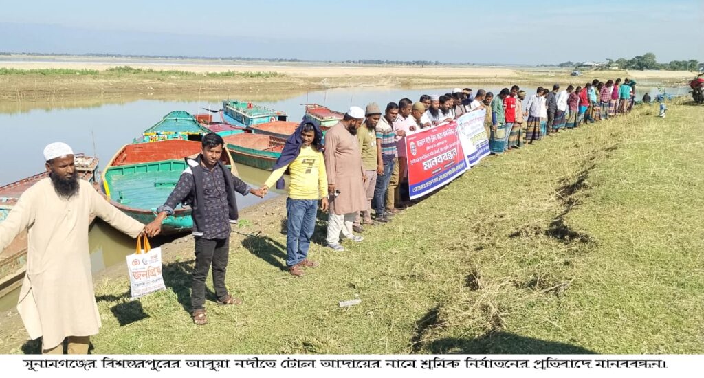 সুনামগঞ্জের নদী পথে অতিরিক্ত টোল আদায়ের নামে চাঁদাবাজী ও শ্রমিক নির্যাতনের প্রতিবাদে মানববন্ধন